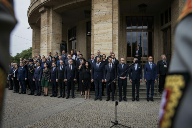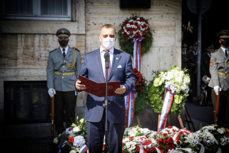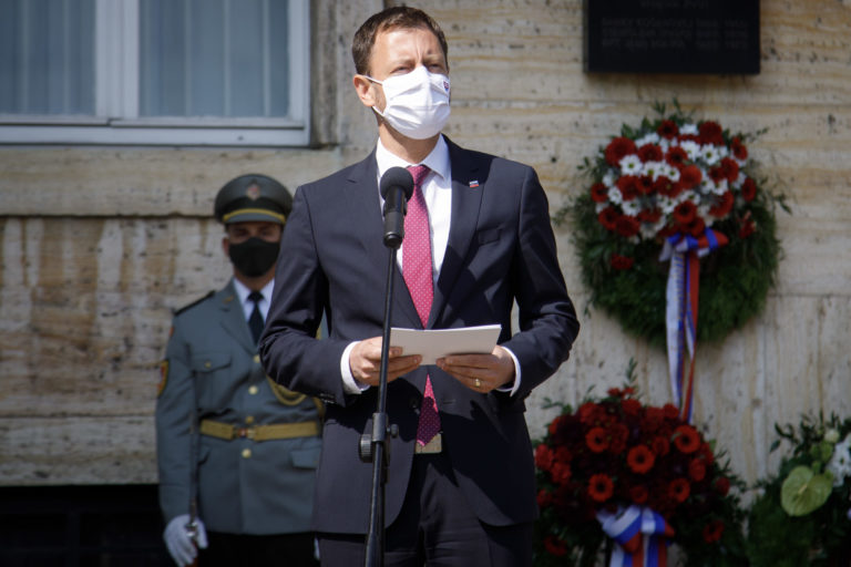 Predseda vlády SR Eduard Heger počas pietnej spomienky na obete okupácie Československa pri pamätnej tabuli na budove Univerzity Komenského. Bratislava, 21. august 2021. Foto: SITA/Branislav Bibel