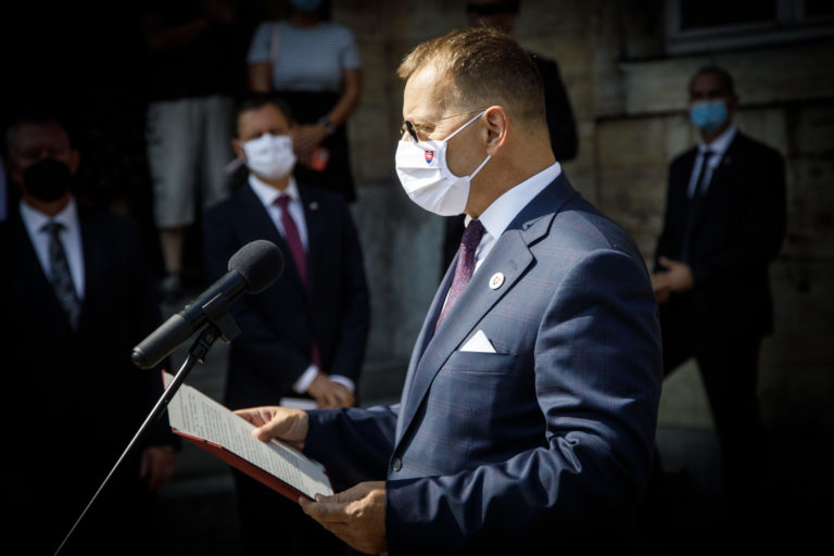 Predseda parlamentu Boris Kollár počas pietnej spomienky na obete okupácie Československa pri pamätnej tabuli na budove Univerzity Komenského. Bratislava, 21. august 2021. Foto: SITA/Branislav Bibel