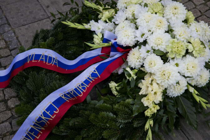 Predseda parlamentu Boris Kollár (vľavo v popredí) počas pietnej spomienky na obete okupácie Československa pri pamätnej tabuli na budove Univerzity Komenského. Bratislava, 21. august 2021. Foto: SITA/Branislav Bibel