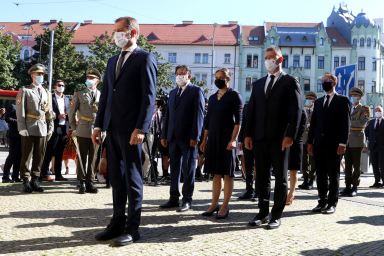 Zľava v popredí: Premiér SR Igor Matovič, minister životného prostredia SR Ján Budaj, ministerka spravodlivosti SR Mária Kolíková a minister vnútra SR Roman Mikulec počas kladenia vencov v rámci pietnej spomienky na obete okupácie Československa vojskami Varšavskej zmluvy v roku 1968 pred budovou Univerzity Komenského v Bratislave. Bratislava, 21. august 2020. Foto: SITA/Ministerstvo obrany SR