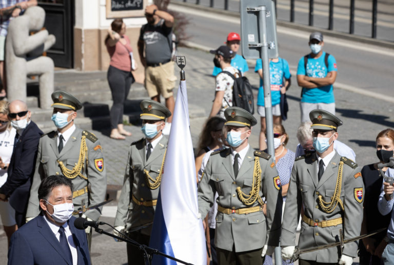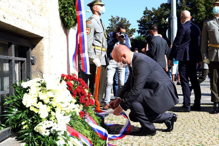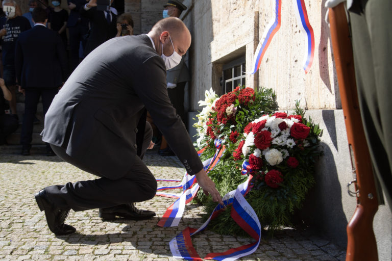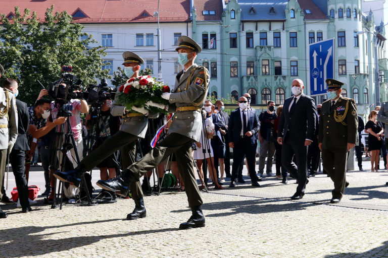 Minister obrany SR Jaroslav Naď (v popredí) počas kladenia vencov v rámci pietnej spomienky na obete okupácie Československa vojskami Varšavskej zmluvy v roku 1968 pred budovou Univerzity Komenského v Bratislave. Bratislava, 21. august 2020. Foto: SITA/Ministerstvo obrany SR