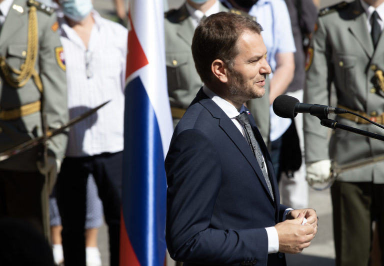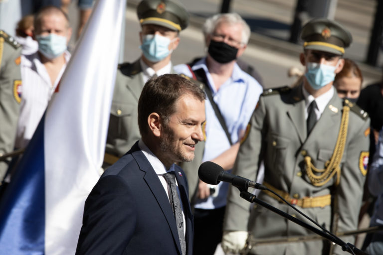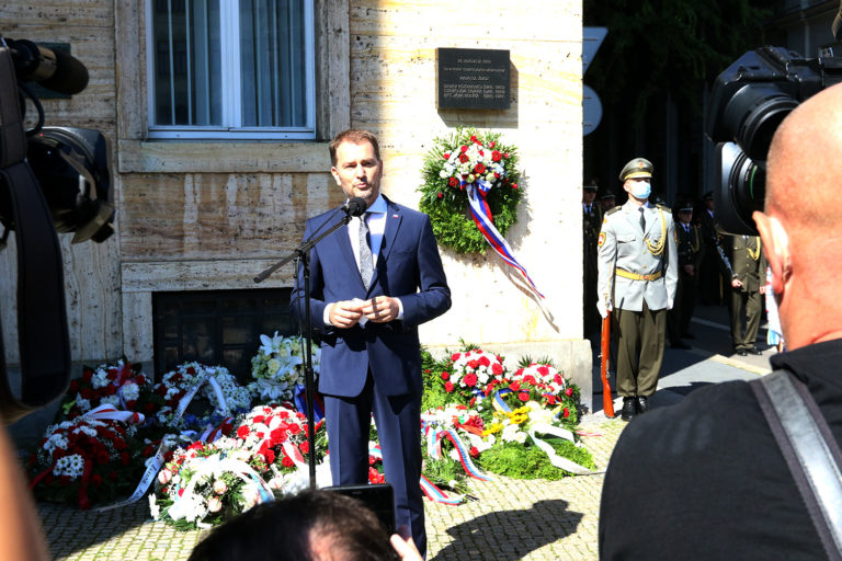 Premiér SR Igor Matovič v príhovore počas pietnej spomienky na obete okupácie Československa vojskami Varšavskej zmluvy v roku 1968 pred budovou Univerzity Komenského v Bratislave. Bratislava, 21. august 2020. Foto: SITA/Ministerstvo obrany SR