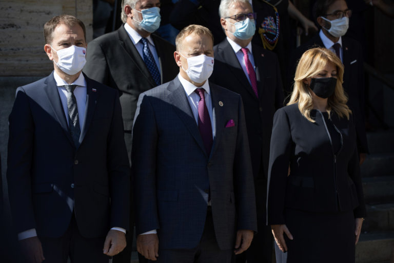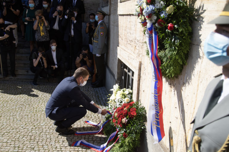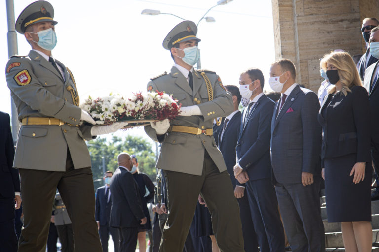 Zľava v popredí: Premiér SR Igor Matovič, predseda Národnej rady SR Boris Kollár a prezidentka SR Zuzana Čaputová počas pietnej spomienky na obete okupácie Československa vojskami Varšavskej zmluvy v roku 1968 pri pamätnej tabuli pred budovou Univerzity Komenského v Bratislave. Bratislava, 21. august 2020. Foto: SITA/Branislav Bibel