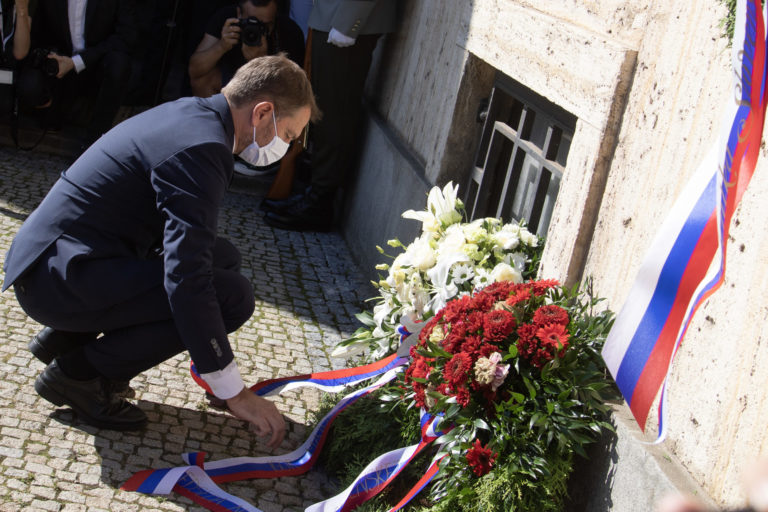 Premiér SR Igor Matovič počas kladenia vencov v rámci pietnej spomienky na obete okupácie Československa vojskami Varšavskej zmluvy v roku 1968 pri pamätnej tabuli pred budovou Univerzity Komenského v Bratislave. Bratislava, 21. august 2020. Foto: SITA/Branislav Bibel