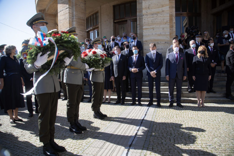 Sprava v prvej rade: Prezidentka SR Zuzana Čaputová, predseda Národnej rady SR Boris Kollár, premiér SR Igor Matovič, podpredseda NR SR za stranu Za ľudí Juraj eliga a minister vnútra SR Roman Mikulec počas kladenia vencov v rámci pietnej spomienky na obete okupácie Československa vojskami Varšavskej zmluvy v roku 1968 pri pamätnej tabuli pred budovou Univerzity Komenského v Bratislave. Bratislava, 21. august 2020. Foto: SITA/Branislav Bibel