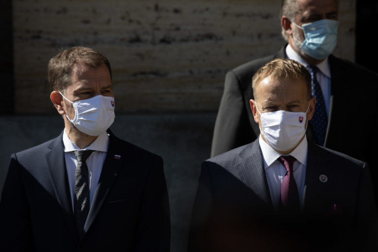 Zľava: Premiér SR Igor Matovič a predseda Národnej rady SR Boris Kollár počas pietnej spomienky na obete okupácie Československa vojskami Varšavskej zmluvy v roku 1968 pri pamätnej tabuli pred budovou Univerzity Komenského v Bratislave. Bratislava, 21. august 2020. Foto: SITA/Branislav Bibel