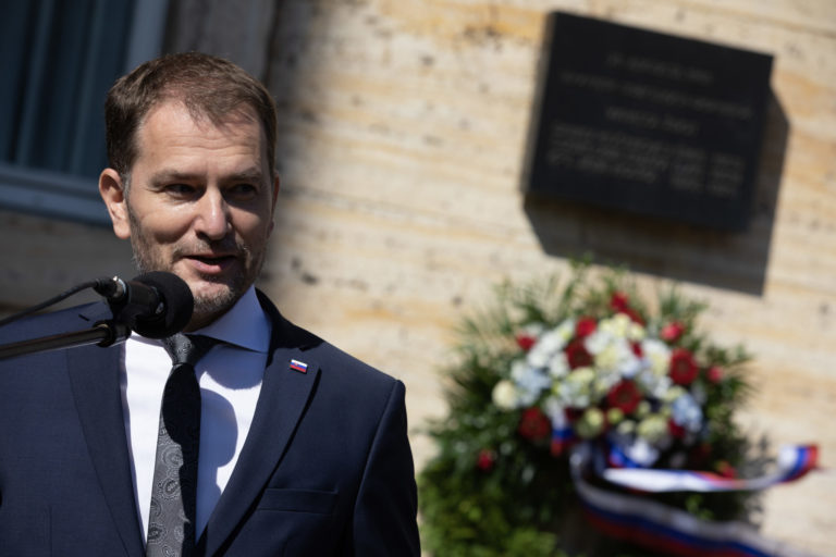 Premiér SR Igor Matovič v príhovore počas pietnej spomienky na obete okupácie Československa vojskami Varšavskej zmluvy v roku 1968 pred budovou Univerzity Komenského v Bratislave. Bratislava, 21. august 2020. Foto: SITA/Branislav Bibel