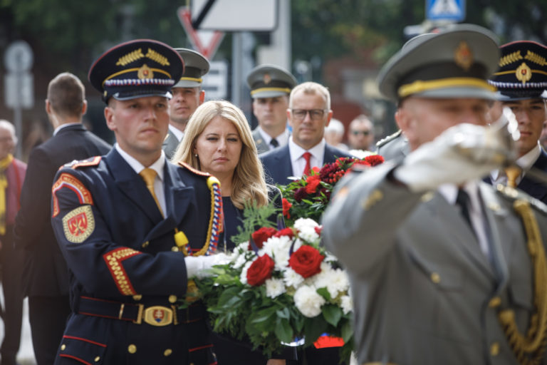 Prezidentka SR Zuzana Čaputová (uprostred vľavo) a predseda Národnej rady SR Boris Kollár (uprostred vpravo) počas pietnej spomienky na obete okupácie z augusta 1968 organizovanej Konfederáciou politických väzňov Slovenska pred budovou Univerzity Komenského v Bratislave. Bratislava, 19. august 2022. Foto: SITA/Branislav Bibel