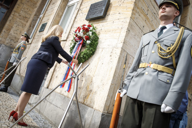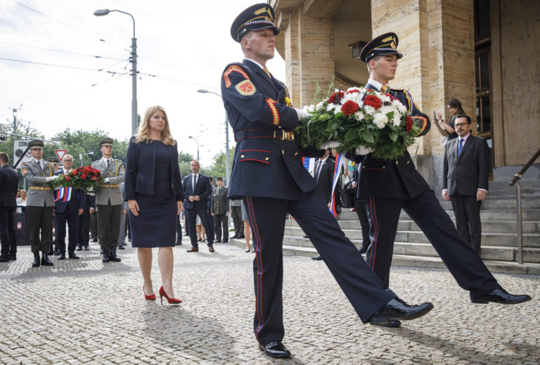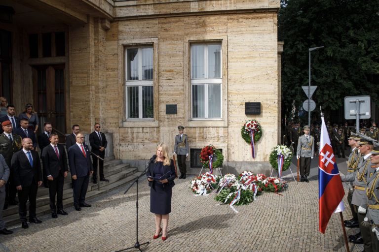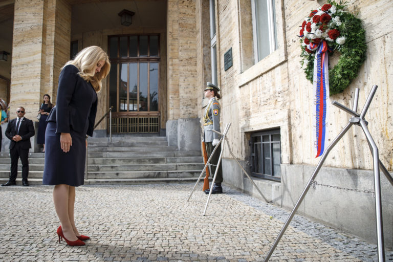 Prezidentka SR Zuzana Čaputová počas pietnej spomienky na obete okupácie z augusta 1968 organizovanej Konfederáciou politických väzňov Slovenska pred budovou Univerzity Komenského v Bratislave. Bratislava, 19. august 2022. Foto: SITA/Branislav Bibel