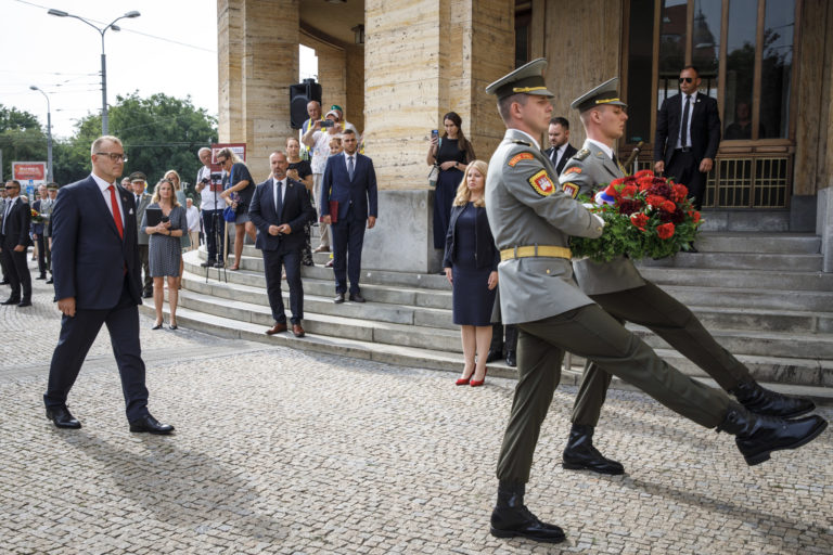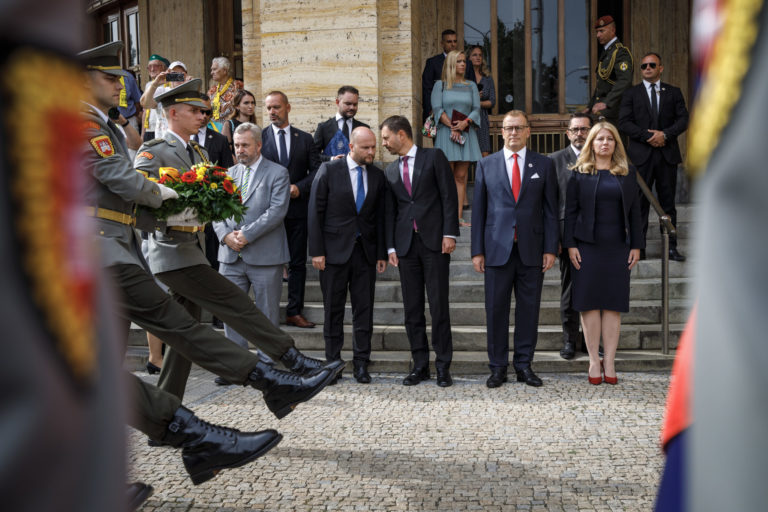Zľava: Minister obrany SR Jaroslav Naï, predseda vlády SR Eduard Heger, predseda Národnej rady SR Boris Kollár a prezidentka SR Zuzana Čaputová počas pietnej spomienky na obete okupácie z augusta 1968 organizovanej Konfederáciou politických väzňov Slovenska pred budovou Univerzity Komenského v Bratislave. Bratislava, 19. august 2022. Foto: SITA/Branislav Bibel Foto: SITA/Branislav Bibel