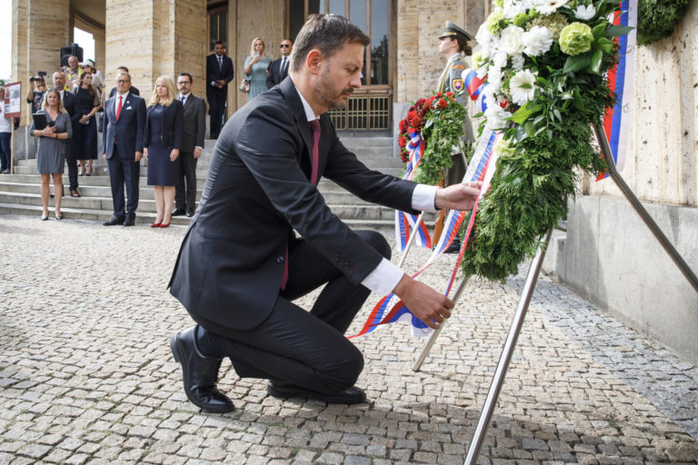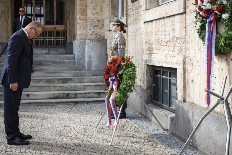 Premiér SR Eduard Heger (v popredí) počas pietnej spomienky na obete okupácie z augusta 1968 organizovanej Konfederáciou politických väzňov Slovenska pred budovou Univerzity Komenského v Bratislave. Bratislava, 19. august 2022. Foto: SITA/Branislav Bibel