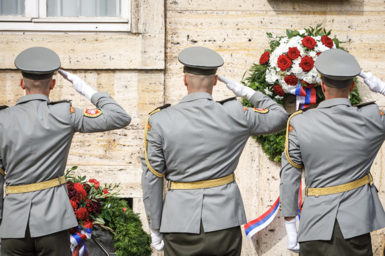 Čestná stráž Ozbrojených síl SR počas pietnej spomienky na obete okupácie z augusta 1968 organizovanej Konfederáciou politických väzňov Slovenska pred budovou Univerzity Komenského v Bratislave. Bratislava, 19. august 2022. Foto: SITA/Branislav Bibel