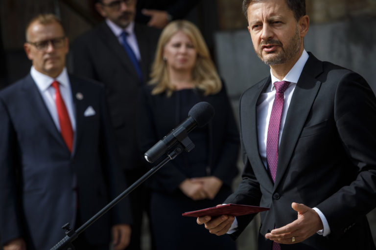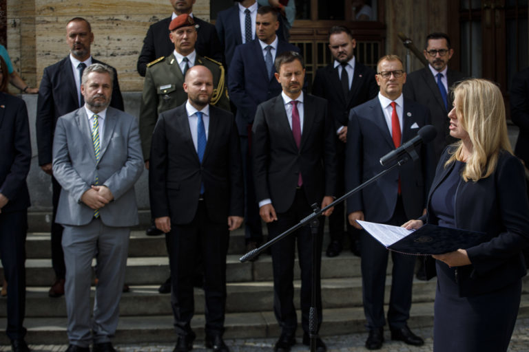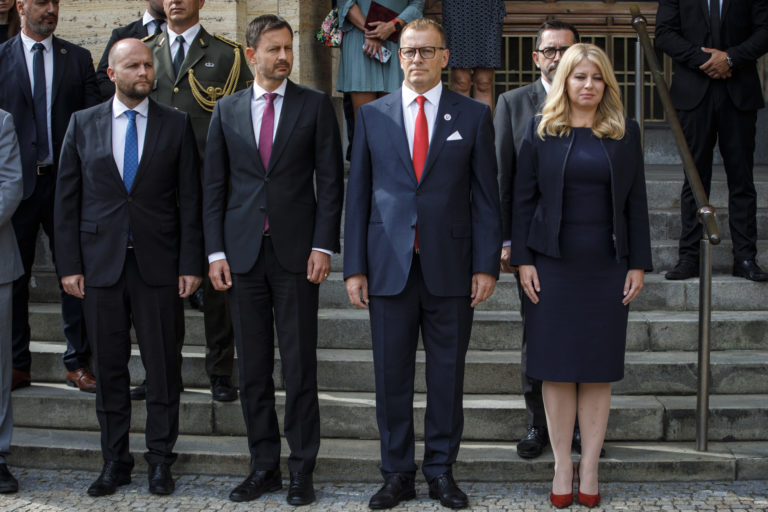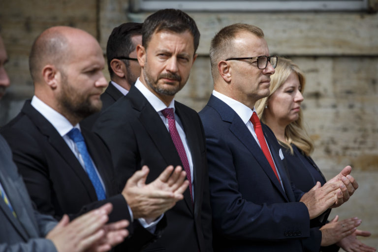 Zľava: Minister obrany SR Jaroslav Naď, predseda vlády SR Eduard Heger, predseda Národnej rady SR Boris Kollár a prezidentka SR Zuzana Čaputová. Foto: SITA/Branislav Bibel
