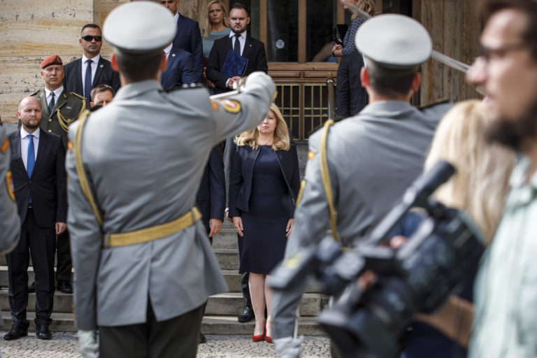 Zľava v popredí: Čestná stráž ozbrojených síl SR, štatny tajomník ministerstva spravodlivosti SR Ondrej Dostál, minister obrany SR Jaroslav Naď, predseda vlády SR Eduard Heger, predseda Národnej rady SR Boris Kollár a prezidentka SR Zuzana Čaputová pred budovou Univerzity Komenského v Bratislave. Bratislava, 19. august 2022. Foto: SITA/Branislav Bibel