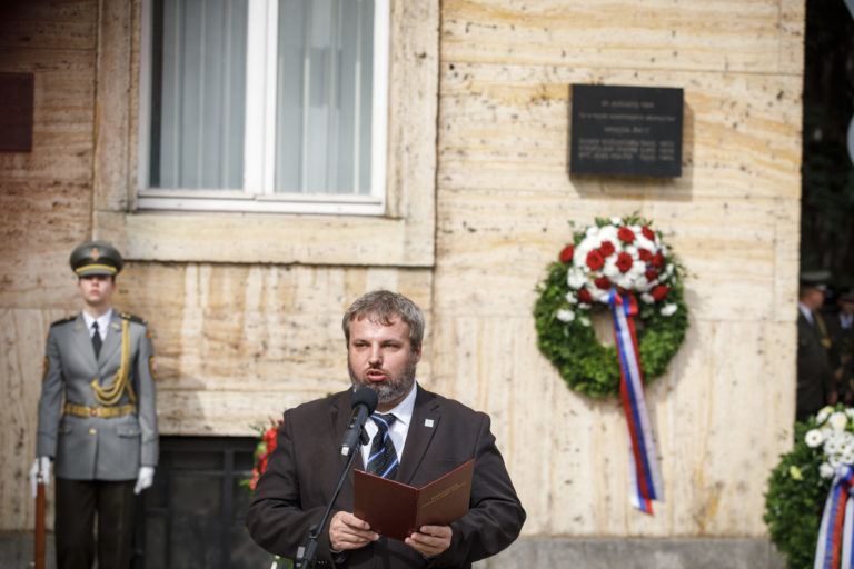 Minister obrany SR Jaroslav Naď počas pietnej spomienky na obete okupácie z augusta 1968 organizovanej Konfederáciou politických väzňov Slovenska pred budovou Univerzity Komenského v Bratislave. Bratislava, 19. august 2022. Foto: SITA/Branislav Bibel