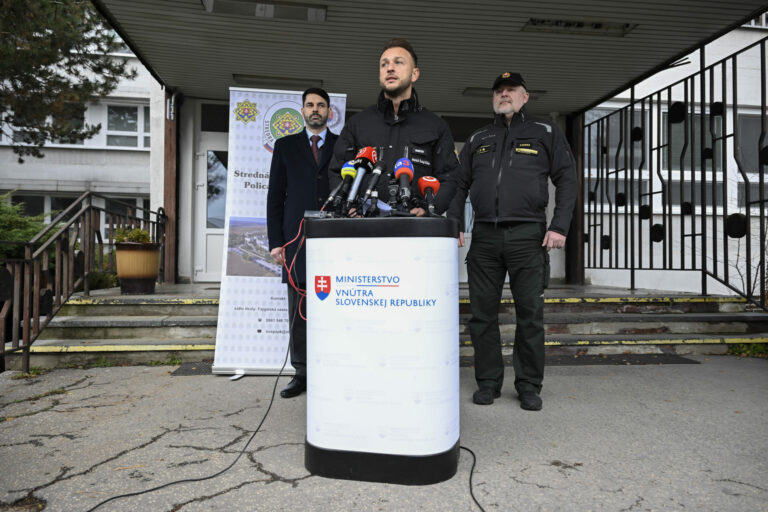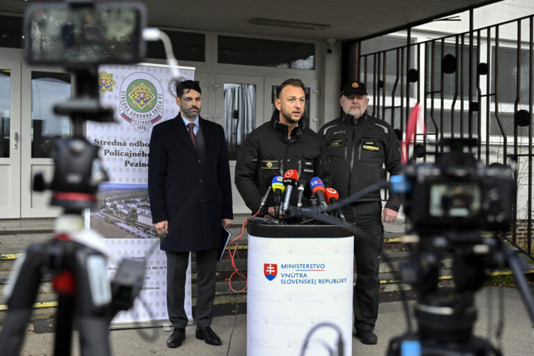 Zľava: Generálny riaditeľ sekcie informatiky, bezpečnosti a telekomunikácií MV SR Martin Hrachala, minister vnútra SR Matúš Šutaj Eštok a prezident Policajného zboru Ľubomír Solák počas tlačovej konferencie ministra vnútra SR na tému: Ministerstvo vnútra (MV) SR začína s pilotnou inštaláciou kamerového systému na školách, v areáli Strednej odbornej školy Policajného zboru v Pezinku. Pezinok, 20. december 2024. Foto: SITA/Milan Illík
