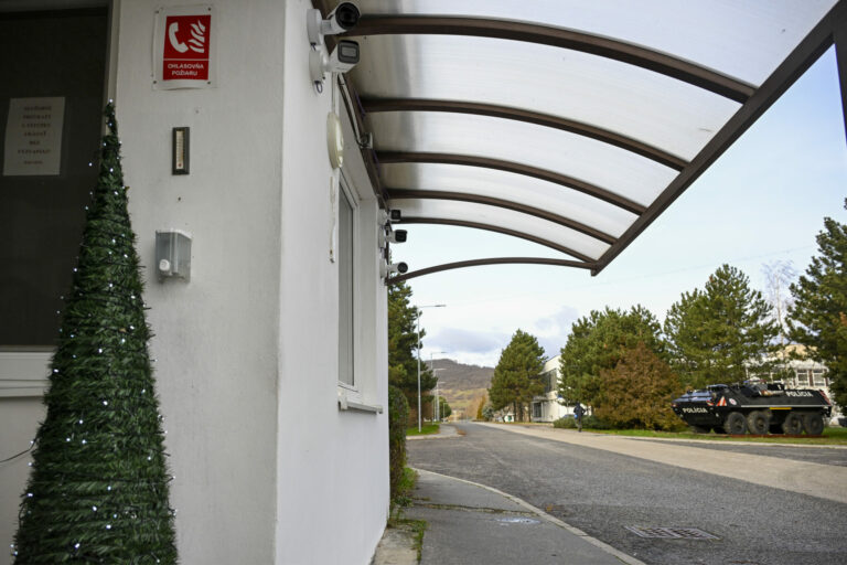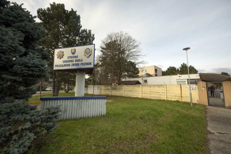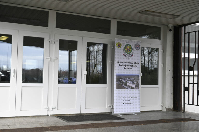 Vstup do areálu školy počas tlačovej konferencie ministra vnútra SR na tému: Ministerstvo vnútra (MV) SR začína s pilotnou inštaláciou kamerového systému na školách, v areáli Strednej odbornej školy Policajného zboru v Pezinku. Pezinok, 20. december 2024. Foto: SITA/Milan Illík