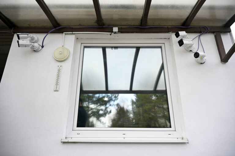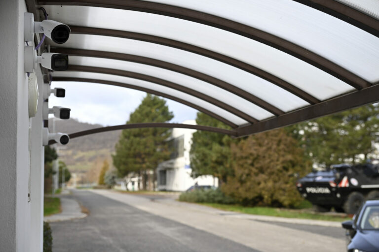 Kamerový systém nainštalovaný pri vchode do školy počas tlačovej konferencie ministra vnútra SR na tému: Ministerstvo vnútra (MV) SR začína s pilotnou inštaláciou kamerového systému na školách, v areáli Strednej odbornej školy Policajného zboru v Pezinku. Pezinok, 20. december 2024. Foto: SITA/Milan Illík