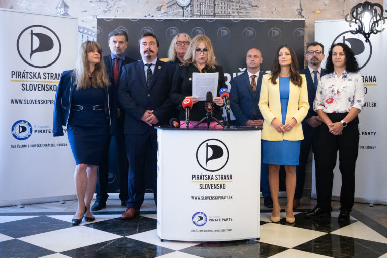 Predsedníčka Pirátskej strany - Slovensko Zuzana Šubová (uprostred) počas brífingu v kaviarni Arthur Café v Bratislave na tému: Slovenskí piráti vstupujú do slovenského volebného ringu. Bratislava, 26. máj 2023. Foto: SITA/Diana Černáková.