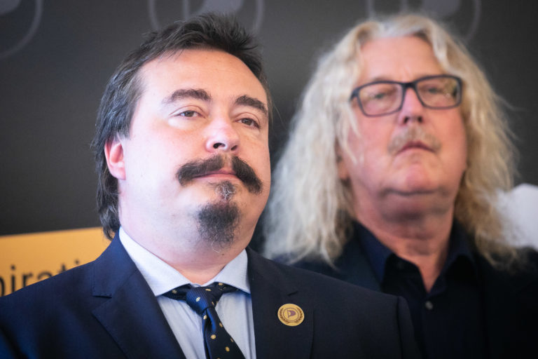 Podpredseda Pirátskej strany - Slovensko Michal Pírek (vľavo) počas brífingu v kaviarni Arthur Café v Bratislave na tému: Slovenskí piráti vstupujú do slovenského volebného ringu. Bratislava, 26. máj 2023. Foto: SITA/Diana Černáková.