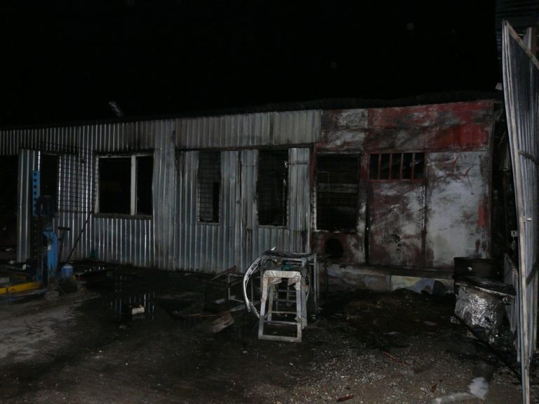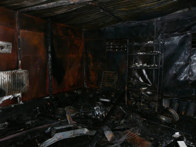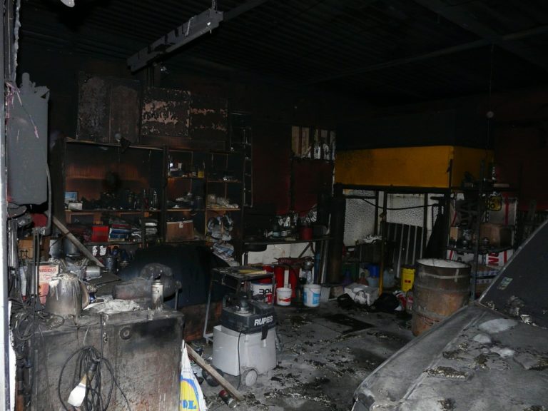 Garáž a dielne po požiari pri Michalovskej ulici v Košiciach. Na mieste zasahovalo deväť hasičov s dvoma cisternami. Oheň poškodil Škodu Rapid, Subaru Forester a Alfu Romeo.