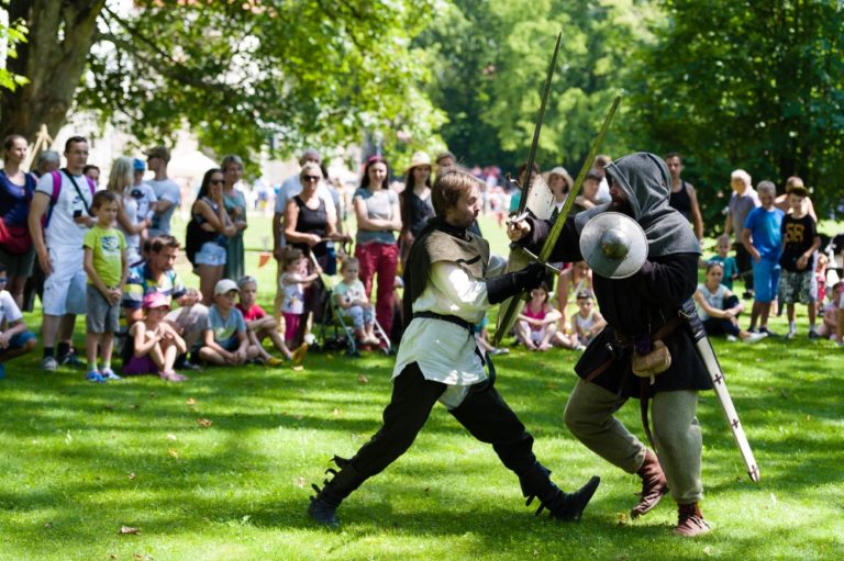 Šermiarska ukážka v parku počas otvorenia Budatínskeho hradu. Žilina, 31. júl 2016. Foto: SITA/Milo Fabian