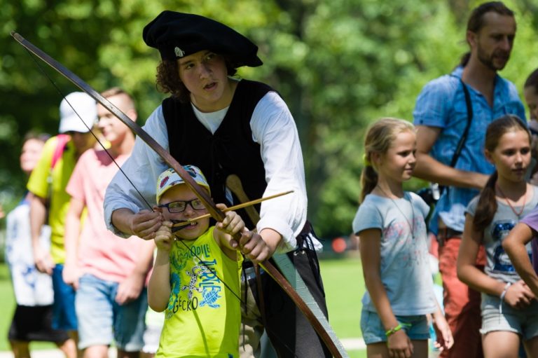 Malý návštevník počas lukostreľby na slamený terč v parku počas otvorenia Budatínskeho hradu. Žilina, 31. júl 2016. Foto: SITA/Milo Fabian