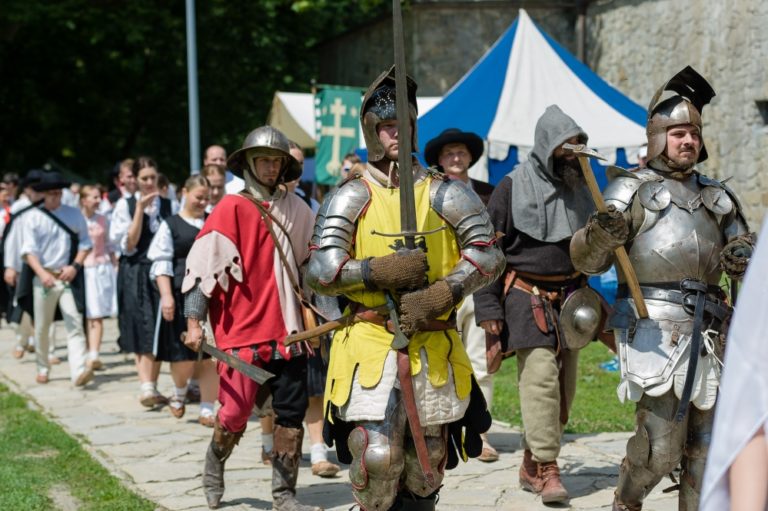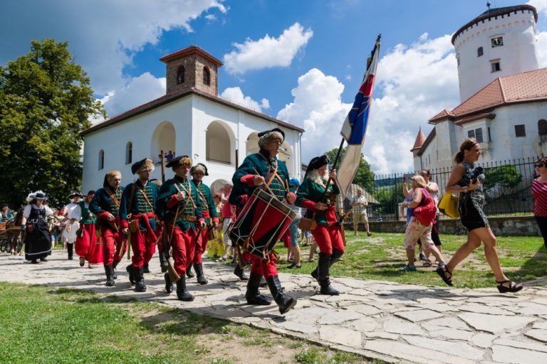 Slávnostný sprievod sa presúva v areáli Budatínskeho hradu počas jeho slávnostného otvorenia. Žilina, 31. júl 2016. Foto: SITA/Milo Fabian