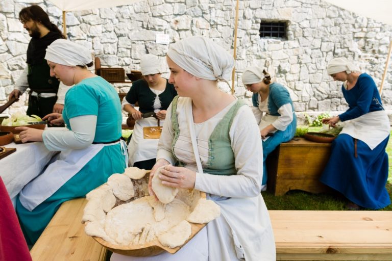 Členky združenia Cech Terra de Selinan pri príprave stredovekých placiek počas slávnostného otvorenia Budatínskeho hradu. Žilina, 31. júl 2016. Foto: SITA/Milo Fabian