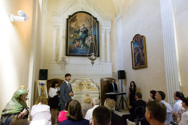 Interiér zrekonštruovanej kaplnky v areáli Budatínskeho hradu počas slávnostného otvorenia kaplnky. Žilina, 31. júl 2016. Foto: SITA/Milo Fabian