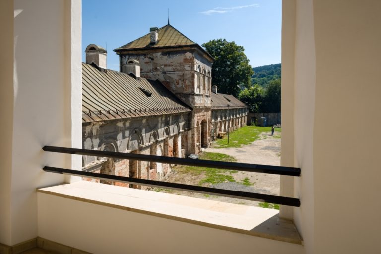 Pohľad z ochodze novootvorenej kaplnky na koniarne hospodárskeho krídla Budatínskeho hradu, ktoré čaká rekonštrukcia, počas slávnostného otvorenia zrekonštruovanej kaplnky. Foto: SITA/Milo Fabian