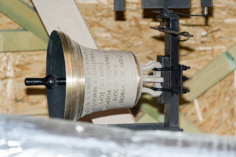 Zvon vo veži zrekonštruovanej kaplnky v areáli Budatínskeho hradu sa rozozvučal po rokoch pri príležitosti slávnostného otvorenia kaplnky. Žilina, 31. júl 2016. Foto: SITA/Milo Fabian