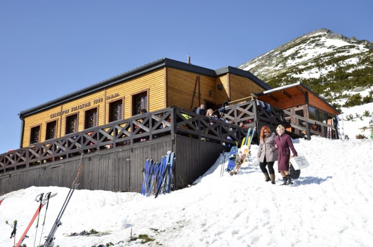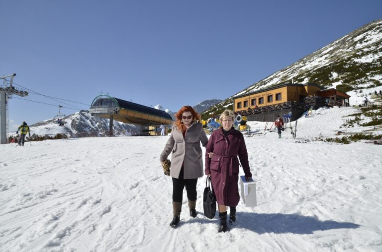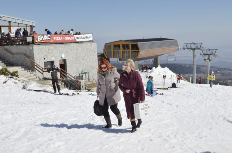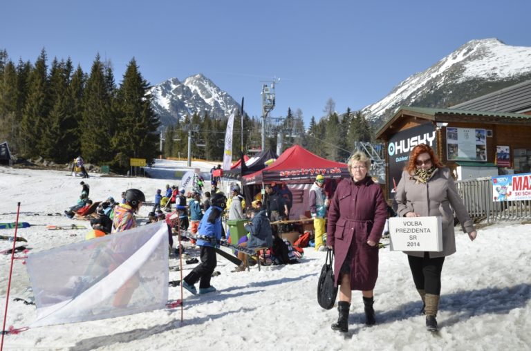 Členky okrskovej volebnej komisie z volebného okrsku na Štrbskom plese priniesli volebnú urnu na Chatu pod Soliskom. Vysoké Tatry, 29. marec 2014. Foto: SITA/Radoslav Maťaš