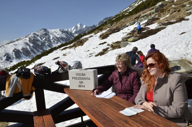 Občan Ján Husár (vľavo) počas volebného aktu v rámci druhého kola voľby prezidenta Slovenskej republiky na Chate pod Soliskom. Vysoké Tatry, 29. marec 2014. Foto: SITA/Radoslav Maťaš
