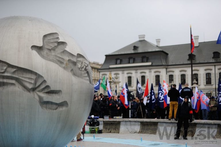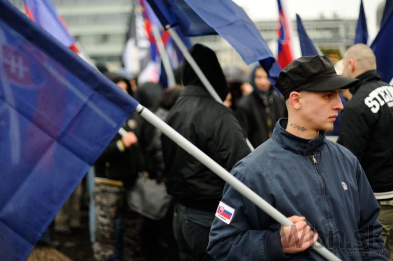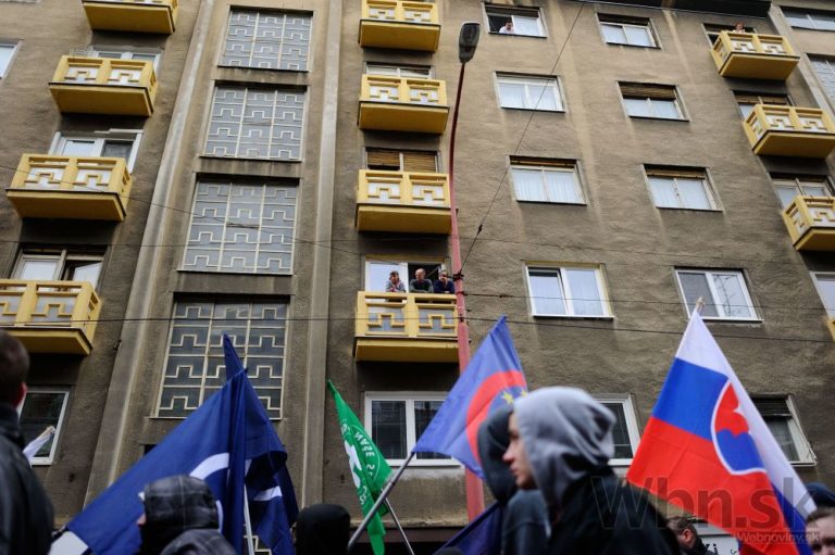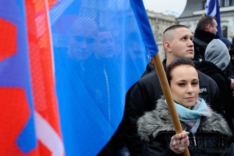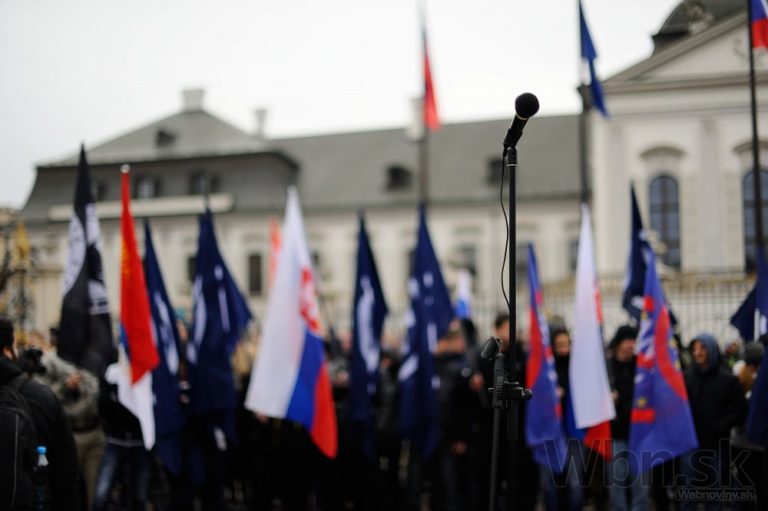 Účastníci pochodu nacionalistov za samostatné Slovensko pred Prezidentským palácom. Bratislava, 14. marec 2015. Foto: SITA/Robert Tappert