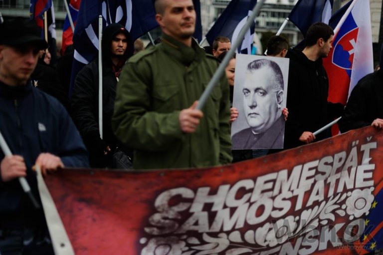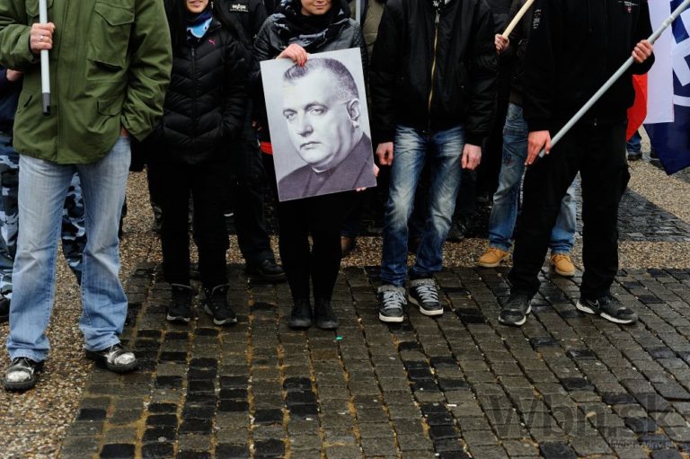 Účastníci pochodu nacionalistov za samostatné Slovensko držia podobizeň bývalého prezidenta vojnového slovenského štátu Jozefa Tisa. Bratislava, 14. marec 2015. Foto: SITA/Robert Tappert
