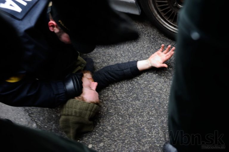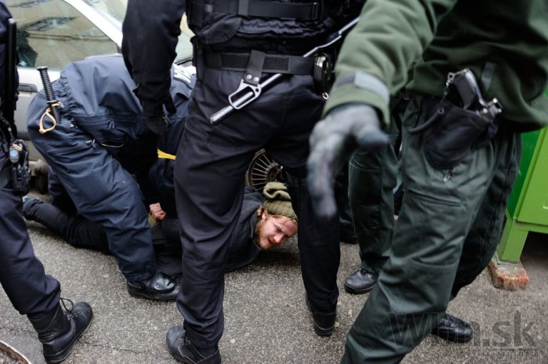 Aktivista Róbert Mihály (na zemi) je zatknutý počas blokády pochodu nacionalistov, ktorý zorganizovala iniciatíva Bratislava bez náckov. Bratislava, 14. marec 2015. Foto: SITA/Robert Tappert