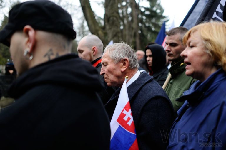 Účastníci pochodu nacionalistov za samostatné Slovensko na Martinskom cintoríne, pri hrobe bývalého prezidenta vojnového slovenského štátu Jozefa Tisa. Bratislava, 14. marec 2015. Foto: SITA/Robert Tappert