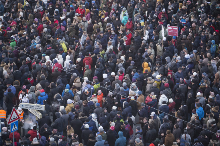 Dav účastníkov na Námestí SNP pred začiatkom spomienkového pochodu na počesť zavraždeného investigatívneho novinára redakcie Aktuality.sk Jána Kuciaka a jeho partnerky Martiny Kušnírovej. Verejné zhromaždenie Nechceme žiť v mafiánskom štáte organizuje hnutie OĽaNO. Bratislava, 28. február 2018. Foto: SITA/Branislav Bibel