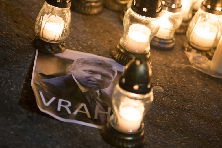 Sviečky a portrét predsedu vlády SR Roberta Fica s nápisom "vrah" pred bránou Úradu vlády SR po skončení spomienkového pochodu na počesť zavraždeného investigatívneho novinára redakcie Aktuality.sk Jána Kuciaka a jeho partnerky Martiny Kušnírovej. Verejné zhromaždenie Nechceme žiť v mafiánskom štáte organizuje hnutie OĽaNO. Bratislava, 28. február 2018. Foto: SITA/Branislav Bibel