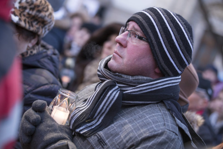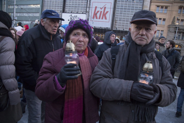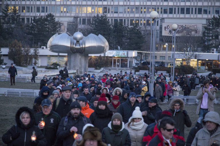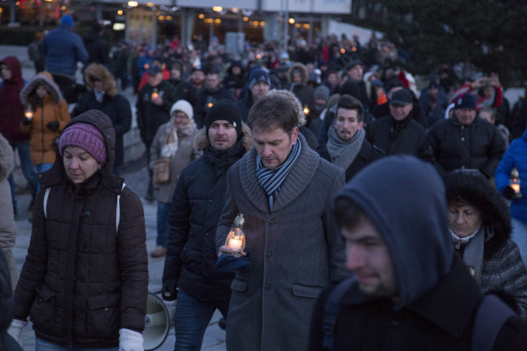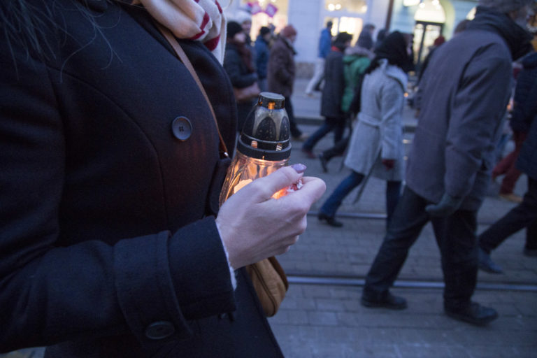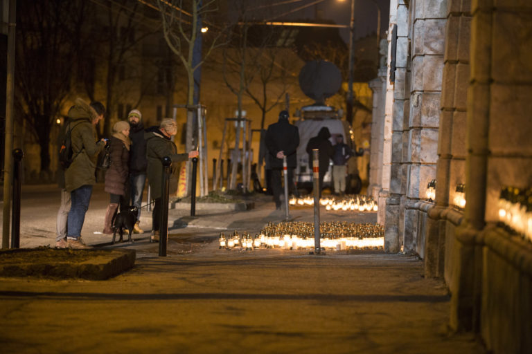Horiace sviecky pred Úradom vlády SR počas pochodu „Nechceme žiť v mafiánskom štáte“ za zavraždeného novinára Jána Kuciaka a jeho partnerky. Bratislava, 28. február 2018. Foto: SITA/AP