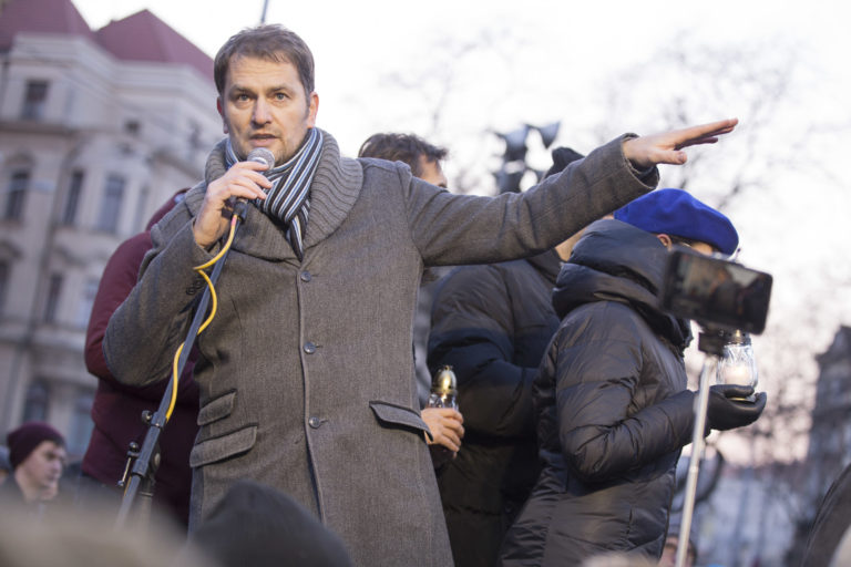 Líder hnutia OĽaNO Igor Matovič v príhovore počas spomienkového pochodu na počesť zavraždeného investigatívneho novinára redakcie Aktuality.sk Jána Kuciaka a jeho partnerky Martiny Kušnírovej. Verejné zhromaždenie Nechceme žiť v mafiánskom štáte organizuje hnutie OĽaNO. Bratislava, 28. február 2018. Foto: SITA/Branislav Bibel
