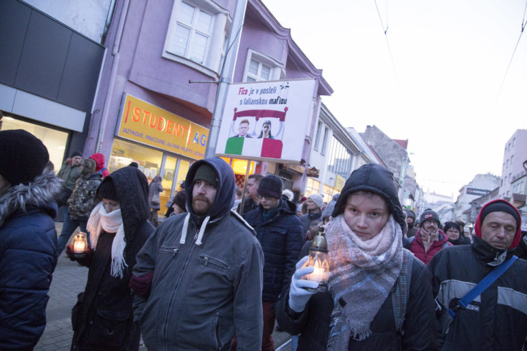 Účastníci pochodu nesú transparenty počas spomienkového pochodu na počesť zavraždeného investigatívneho novinára redakcie Aktuality.sk Jána Kuciaka a jeho partnerky Martiny Kušnírovej na Obchodnej ulici. Verejné zhromaždenie Nechceme žiť v mafiánskom štáte organizuje hnutie OĽaNO. Bratislava, 28. február 2018. Foto: SITA/Branislav Bibel