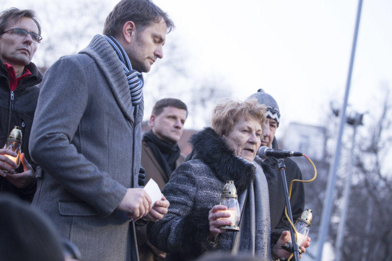Zľava: Podpredseda SaS Ľubomír Galko, líder hnutia OĽaNO Igor Matovič, predseda KDH Alojz Hlina a matka zavraždeného Roberta Remiáša, Anna Remiášová v príhovore počas spomienkového pochodu na počesť zavraždeného investigatívneho novinára redakcie Aktuality.sk Jána Kuciaka a jeho partnerky Martiny Kušnírovej. Verejné zhromaždenie Nechceme žiť v mafiánskom štáte organizuje hnutie OĽaNO. Bratislava, 28. február 2018. SITA / Viktor Zamborský