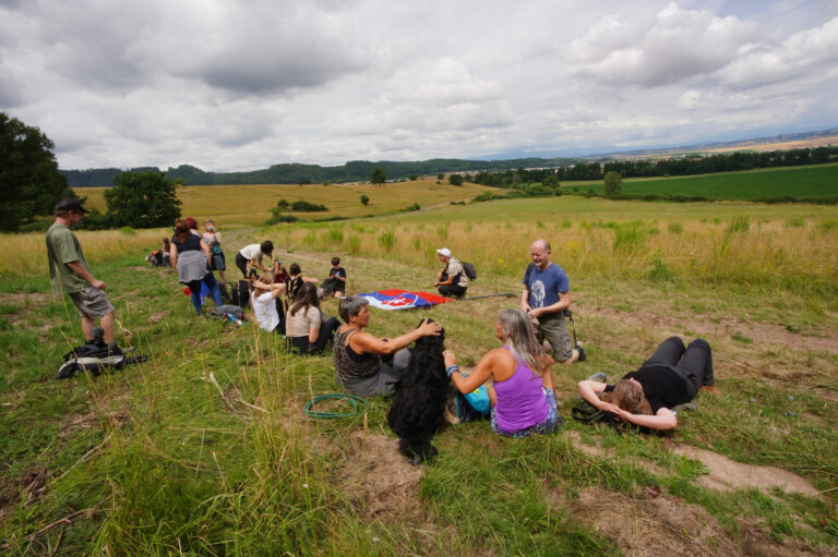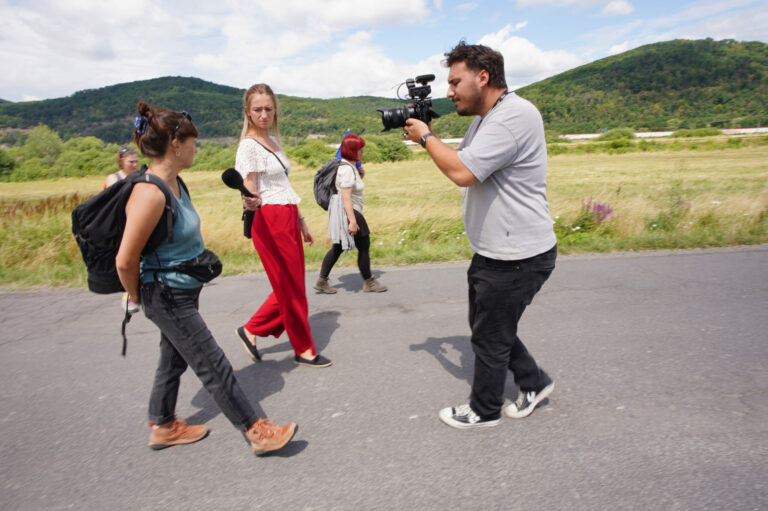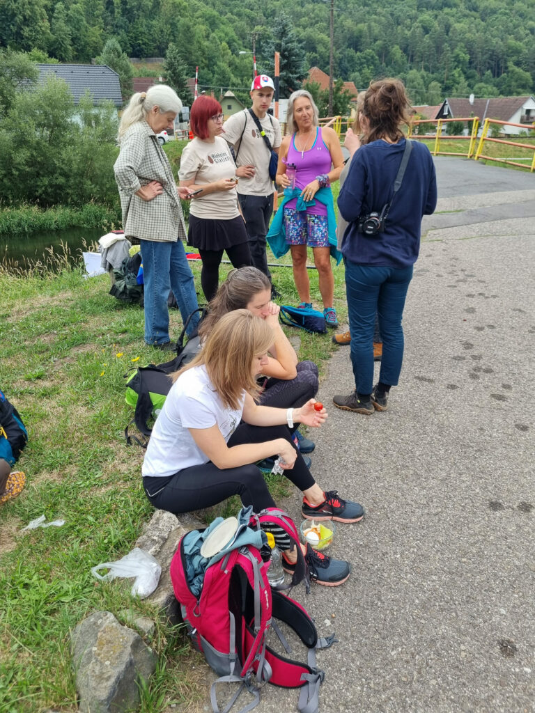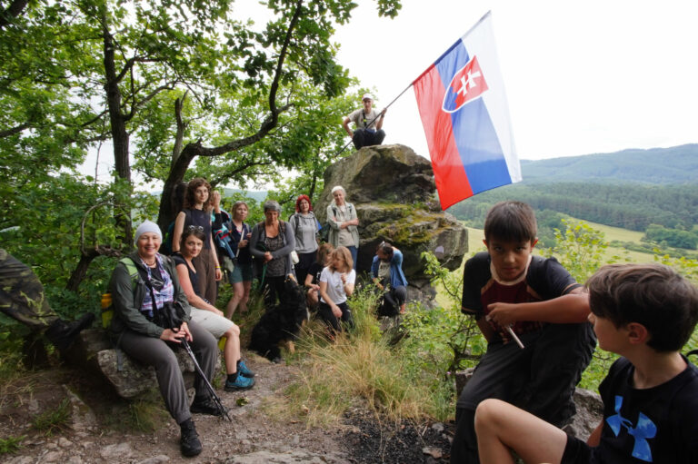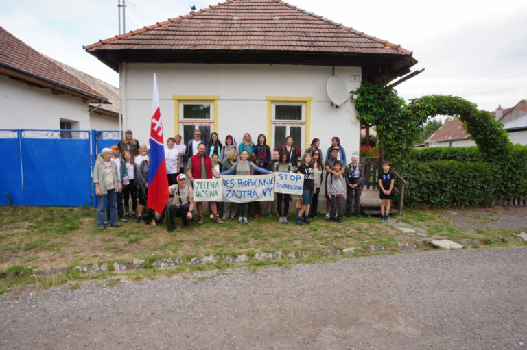 Účastníci počas prvého dňa 40 km pochodu s názvom Dnes Podpoľanie, zajtra vy?, ktorý začal v obci Slatinka cez obce Zvolenská Slatina, Vígľaš, Detva a skončí v obci Hriňová, kde je naplánovaná verejná diskusia za účasti zástupcov Via Iuris, Združenia Slatinka, Združenia Čechánky. Cieľom pochodu je podporiť obyvateľov Podpoľania, aby sa spravodlivo rozhodovalo o prečerpávacej elektrárni v Málinci. Jej plánovaná výstavba môže zaplaviť niektoré časti obcí a ohroziť pitnú vodu pre takmer 63 tisíc ľudí. Podpoľanie, 18. júl 2025. Foto: SITA/Iniciatíva Zelená väčšina