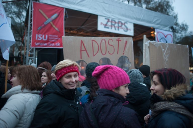 Účastníci akcie Učitelia, ďakujeme! – pochod vďaky rodičov a priateľov škôl na Námestí SNP v Bratislave. Bratislava, 10. február 2016.