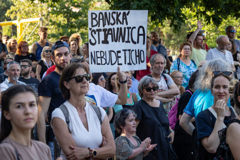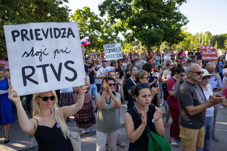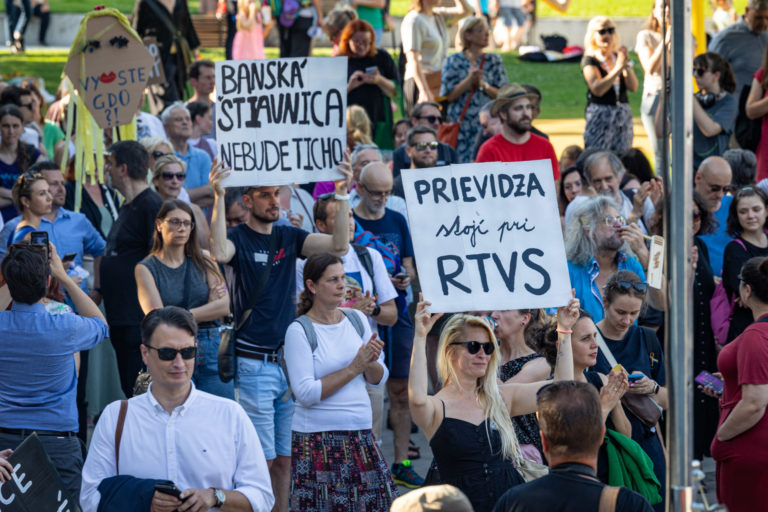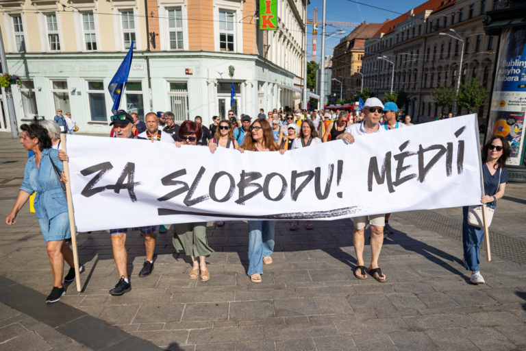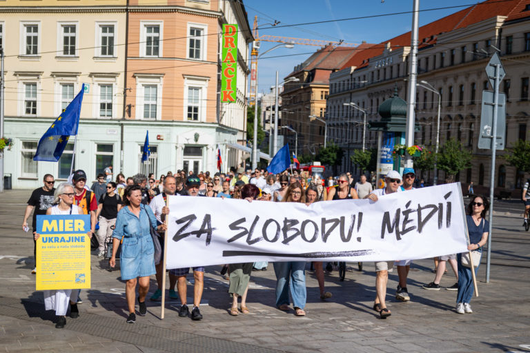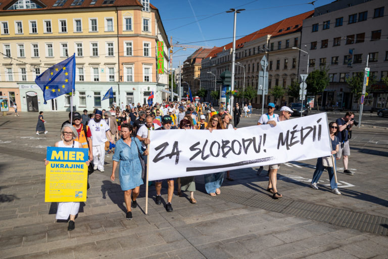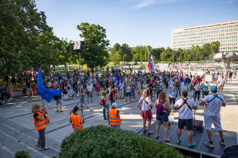 Účastníci počas občianskeho pochodu Za slobodu! Za demokraciu! na Námestí slobody v Bratislave. Bratislava, 18. jún 2024. Foto: SITA/Jana Birošová