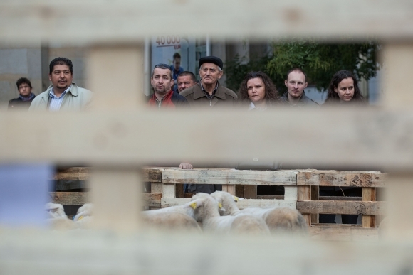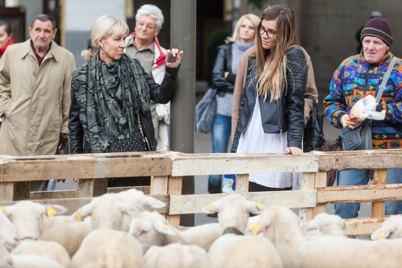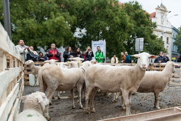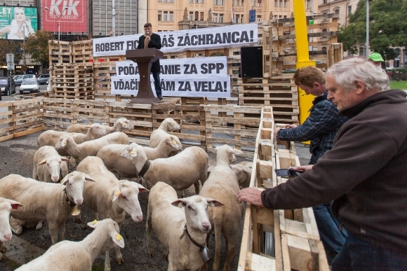 Účastníci netradičného zhromaždenia - Poďakovanie premiérovi R. Ficovi za SPP, ktoré zorganizoval nezaradený poslanec NR SR Alojz Hlina. Bratislava, 10. október 2013. Foto: SITA/Jozef Jakubčo