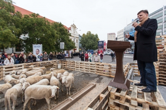 Nezaradený poslanec NR SR Alojz Hlina počas netradičného zhromaždenia - Poďakovanie premiérovi R. Ficovi za SPP. Bratislava, 10. október 2013. Foto: SITA/Jozef Jakubčo