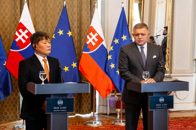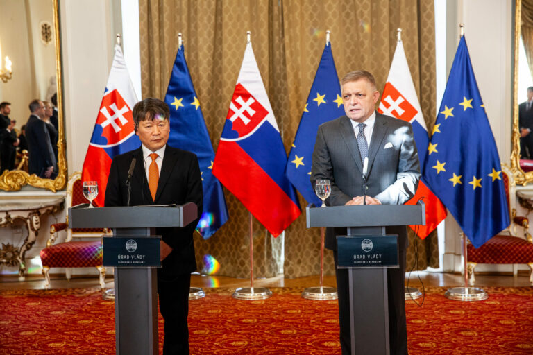 Zľava: Premiér Robert Fico a CEO a prezident Hyundai Mobis Lee Gyu Suk počas spoločného vyhásenia po podpise Memoranda o spolupráci medzi SR a spoločnosťou Hyundai Mobis v priestoroch Úradu vlády SR v Bratislave. Bratislava, 15. október 2024. Foto: SITA/Bokor Tomáš